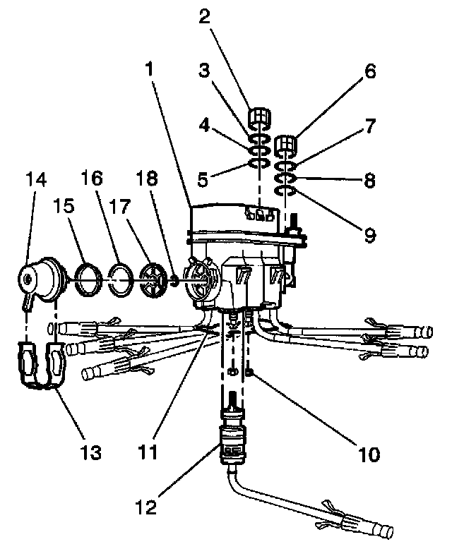 The fuel pressure regulator (1) is a diaphragm-operated cartridge type relief valve with the fuel pump pressure on one side and the regulator spring pressure and intake manifold vacuum on the other side. A retainer clip (2) holds the fuel pressure regulator in the fuel meter body assembly. The fuel pressure regulator maintains a constant pressure differential across the injectors at all times. The pressure regulator compensates for engine load by increasing the fuel pressure as engine vacuum drops.
