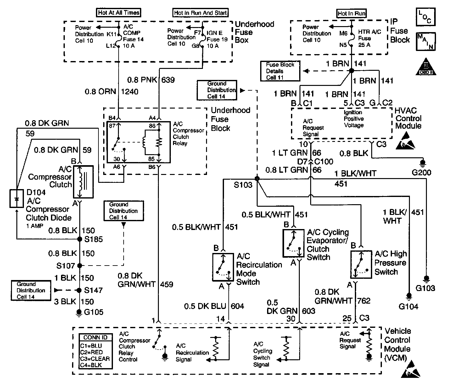 15. The A/C request signal circuit consists of the HVAC control assembly, the NC high pressure cutout switch, and related wiring.