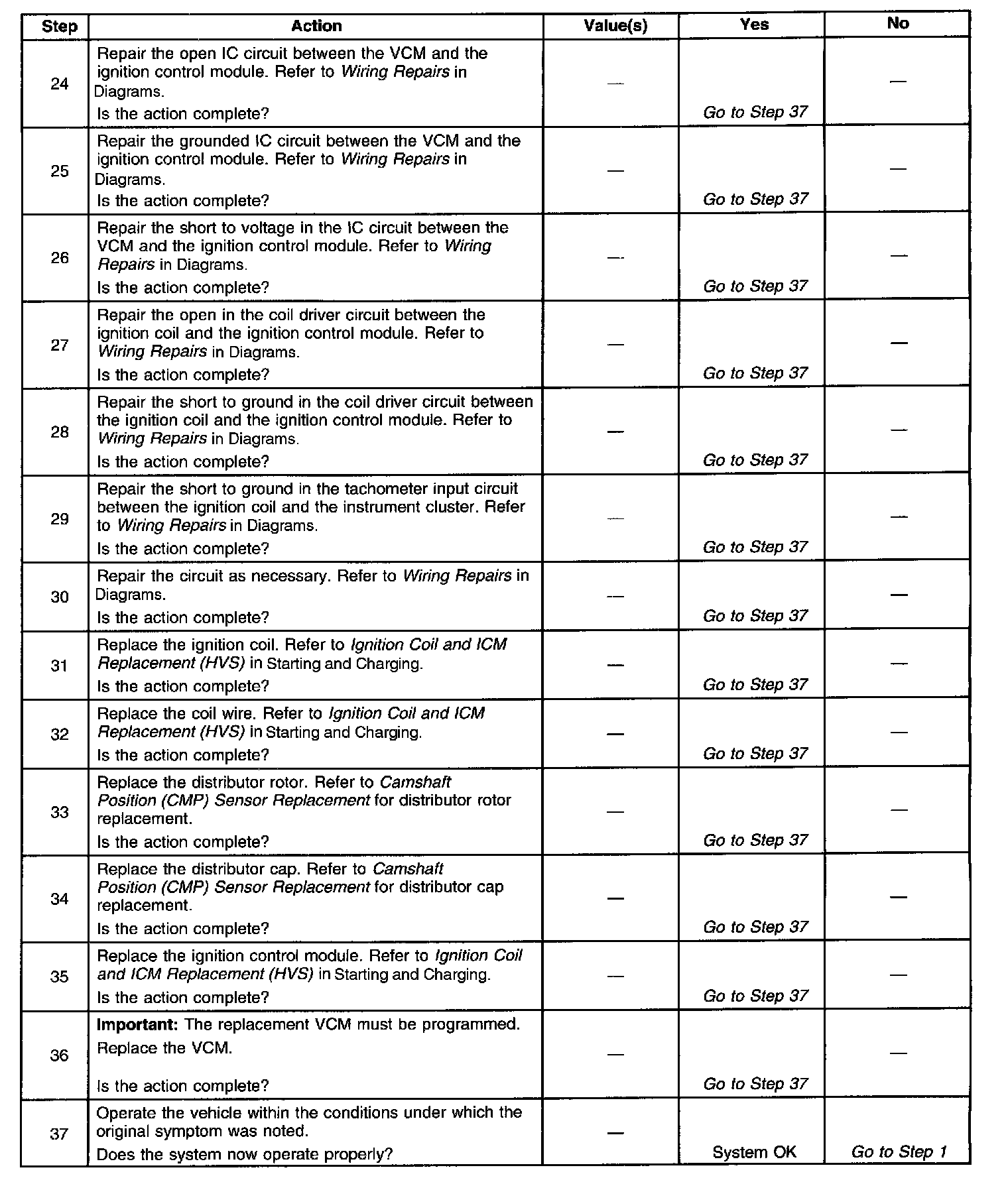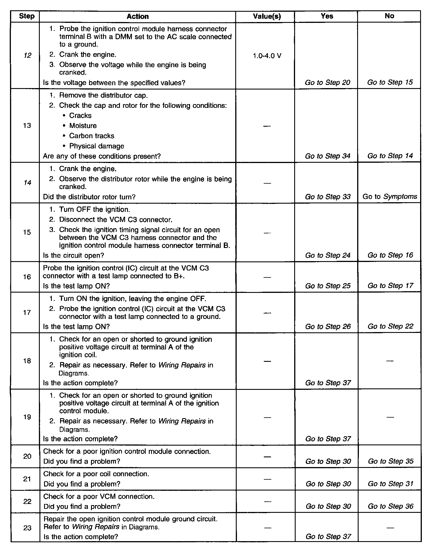 12. This test begins to determine if the VCM is providing a signal to the ignition control module. If the VCM is not providing a signal to the ignition control module, the problem exists between the ignition control module and the VCM.