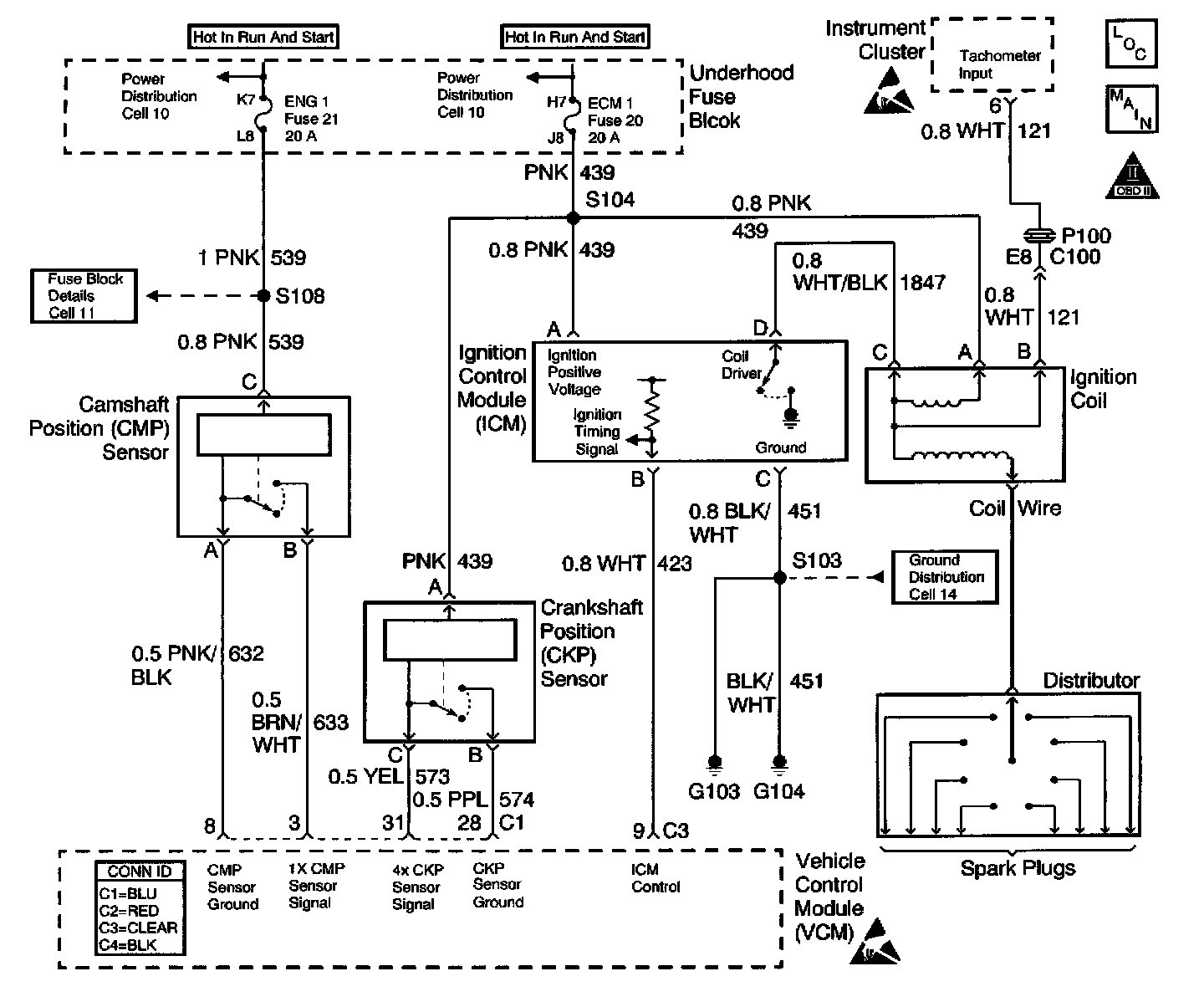 This system includes the distributor, the ignition coil, the ignition control module, the secondary wires, spark plugs, the Vehicle Control Module (VCM) and the crank sensor. The ignition system is controlled by the VCM. The VCM monitors the information from various engine sensors, computes the desired spark timing, and controls the dwell and firing of the ignition coil via an Ignition Control (IC) line to the ignition control module.