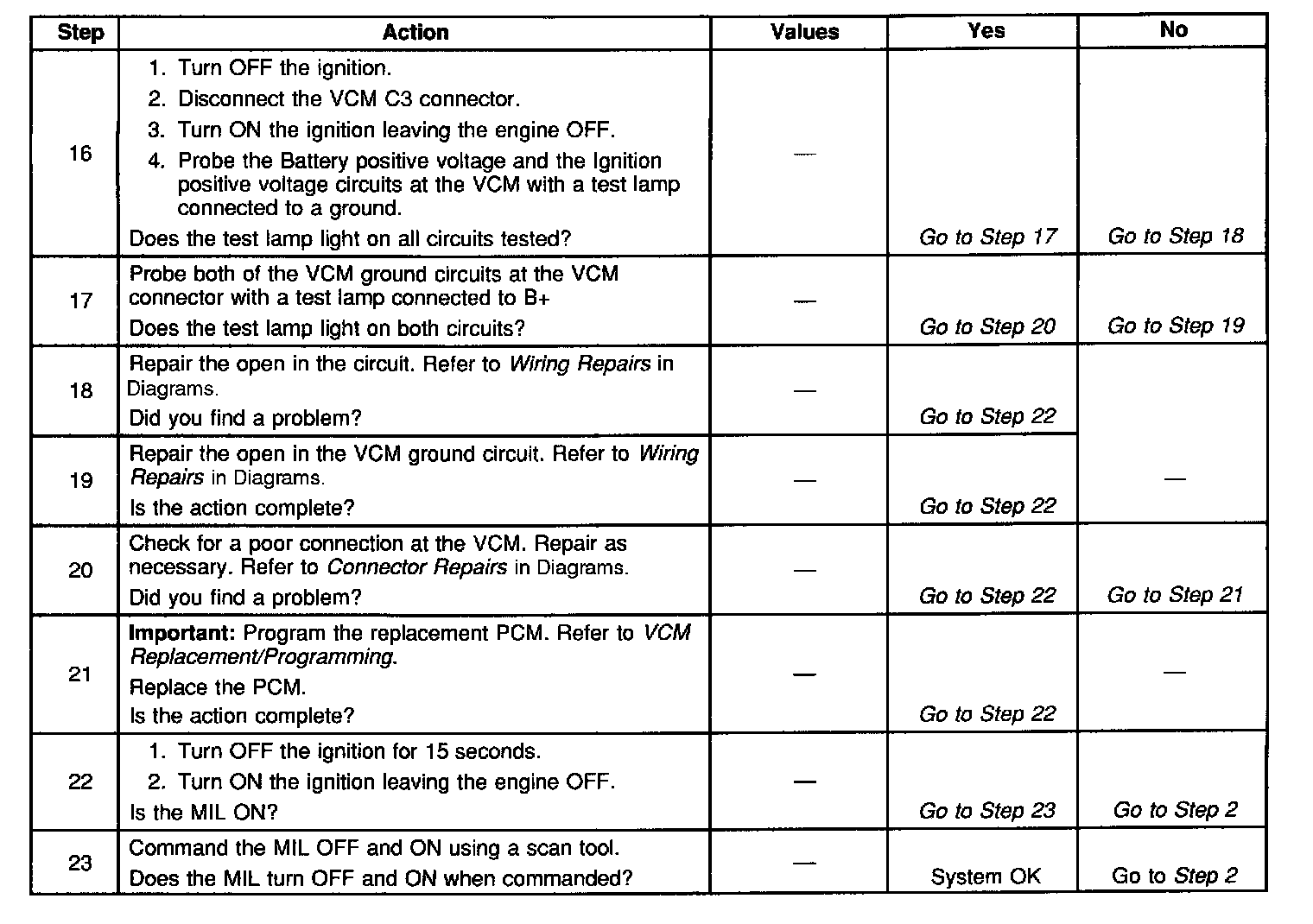6. This step checks the MIL control circuit for a short to B+ or a problem with the VCM.