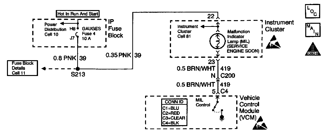 When the ignition switch is initially turned to the run position, the Malfunction Indicator Lamp (MIL) will be ON steady. When the engine is running and there are no active type A or B DTCs stored, refer to Diagnostic Trouble Code (DTC) Type Definitions. The vehicle control module (VCM) turns OFF the MIL. The ignition switch supplies battery voltage directly to the MIL through the gauge fuse. The VCM controls the MIL by providing a ground path through the MIL control circuit in order to turn ON the MIL.