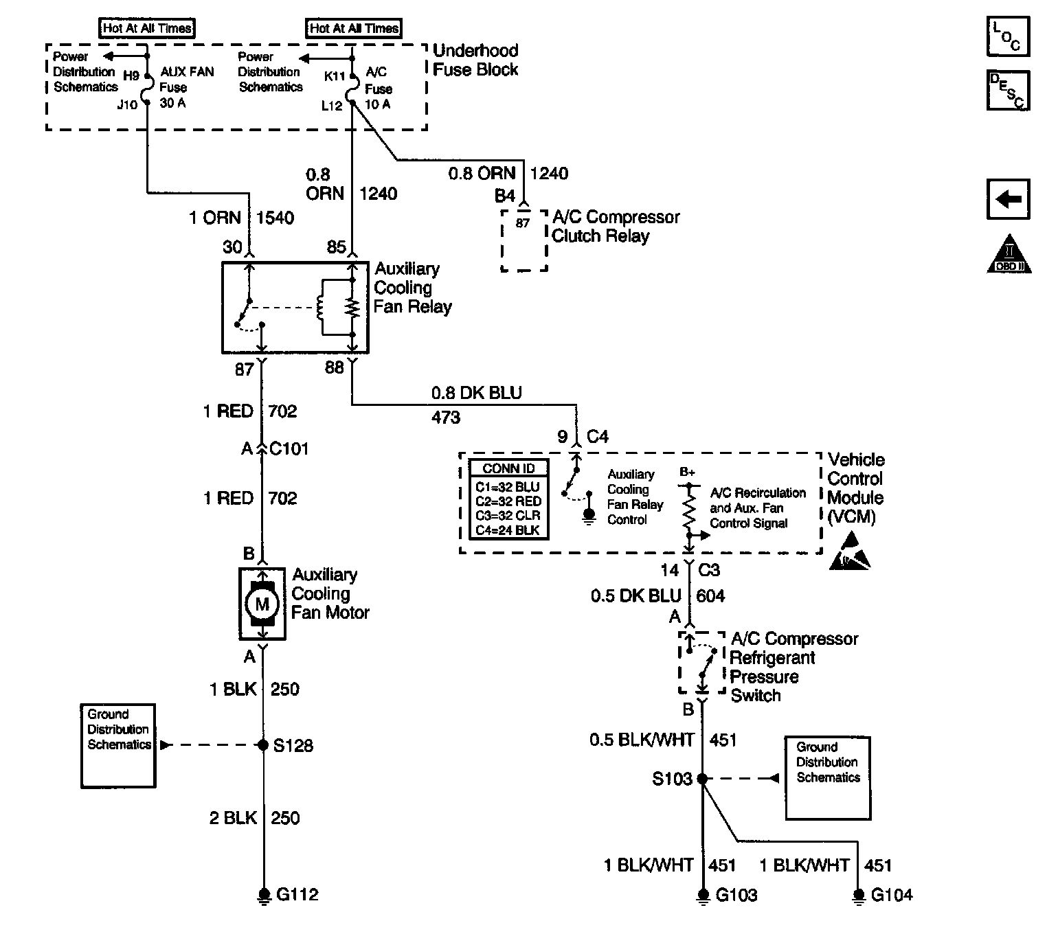Engine Controls Schematics (Base Engine): Auxiliary Engine Cooling Fan Control (Export), A/C Recirc Door Control: