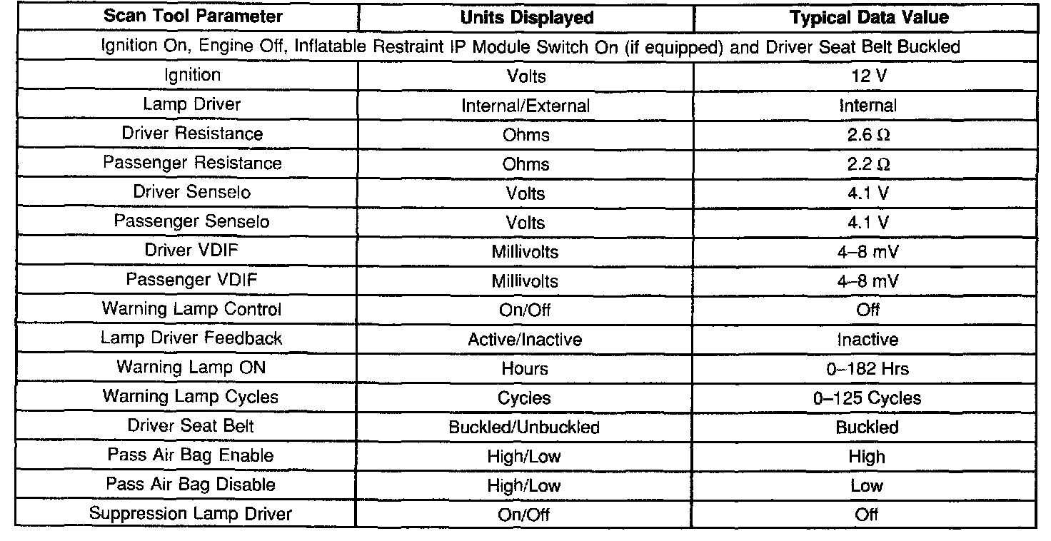 Verify that the scan tool contains the latest diagnostic information before attempting to communicate with the SIR system. In order to use the scan tool, connect the scan tool to the Data Link Connector (DLC) and turn the ignition switch to the RUN position. The scan tool reads the serial data sent from the inflatable restraint Sensing and Diagnostic Module (SDM) serial data output terminal 5 to the DLC terminal 9. The SIR Scan Tool Data List contains all restraint related parameters that are available on the scan tool. The list is arranged in the order as they appear on the scan tool.