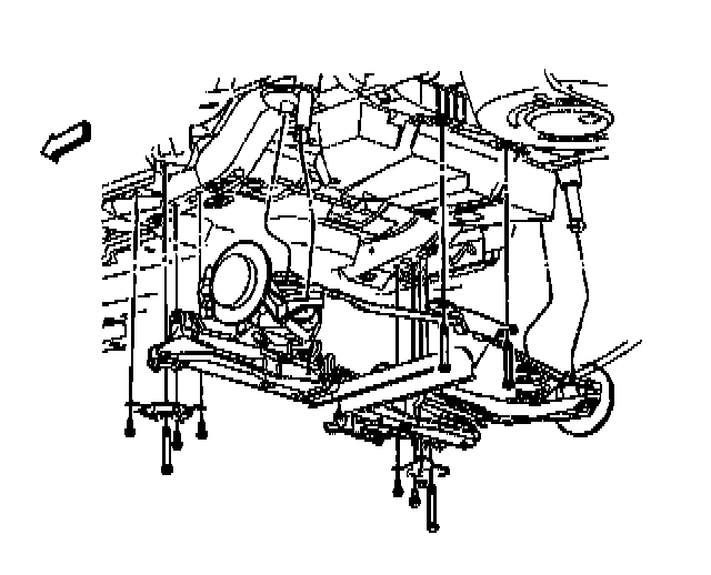 12. Use a transmission jack in order to secure the rear suspension support assembly to the body.