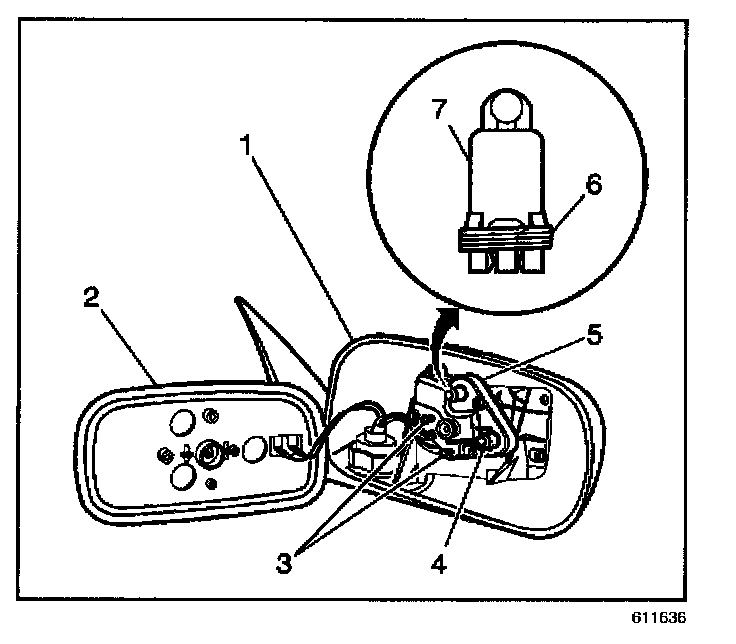 REMOVAL PROCEDURE1. Remove the standard mirror glass assembly (2) from the housing (1) of the outside rear view mirror assembly.