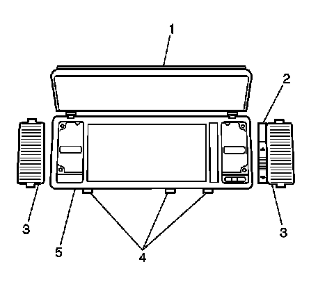 1. Open the vanity cover (1) and use a thin flat-bladed tool to disengage the three front snap legs at the lower edge of the sunshade.