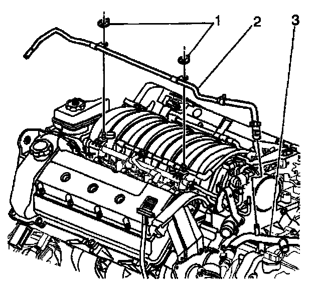 10. Install the four bolts (1) attaching the fuel rail (2) to the intake manifold (3).