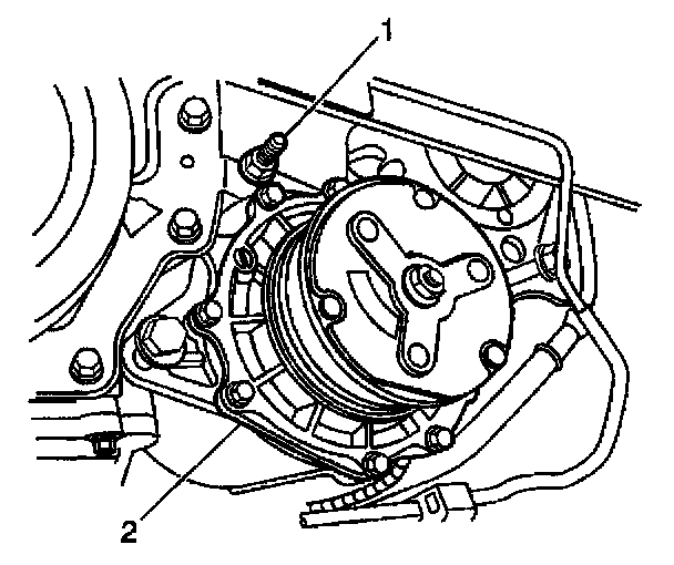 14. Remove the A/C Compressor (2) mounting stud (1).