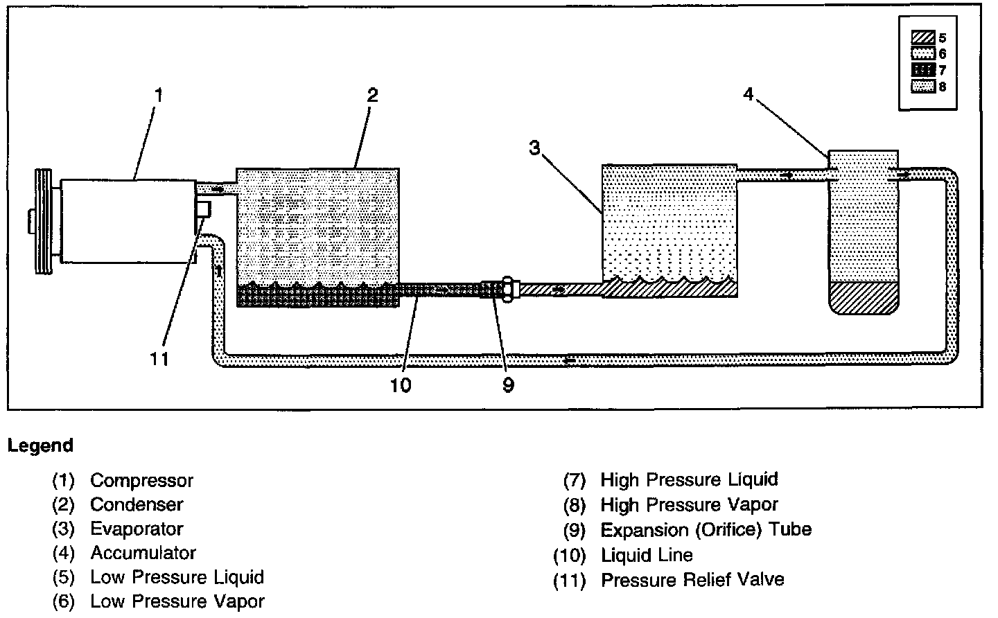 The Variable Displacement Orifice Tube (VDOT) refrigeration system is comprised of a variable displacement compressor and a fixed expansion (orifice) tube. This system can match the air conditioning demands under all conditions without cycling. When the A/C capacity demand is high, the suction pressure will be above the control point: a control valve will bleed discharge gas into the compressor crankcase and close off a passage from the compressor crankcase to the suction plenum.