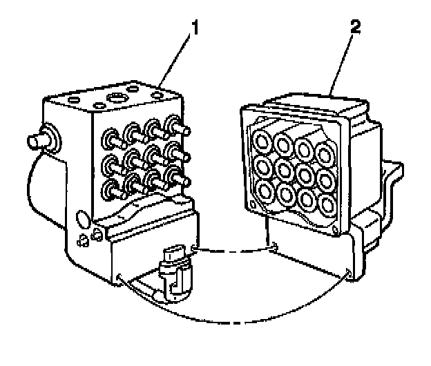 7. Rotate the EBCM connector tab (2) down to the locked position.