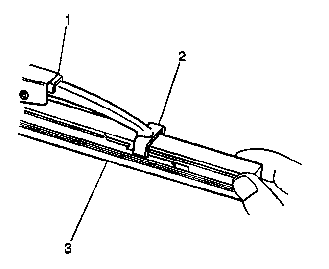 3. Engage the bottom claw (2) of the wiper blade (1) into the notches in wiper blade element (3).