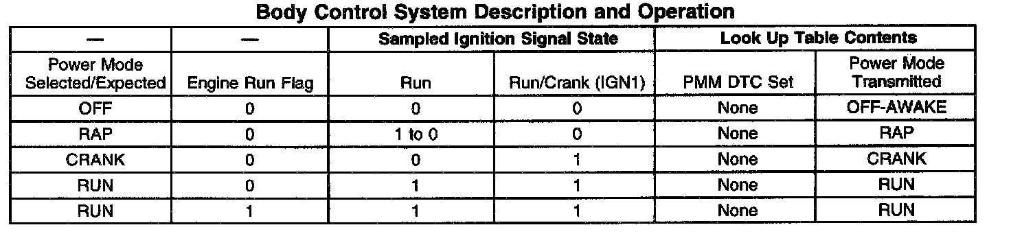 On vehicles that have several control modules connected by serial data circuits, one module is the Power Mode Master (PMM). On this vehicle the PMM is the Body Control Module (BCM). The PMM receives two signals/circuits from the ignition switch. These are the Run/Crank (IGN 1) and Accessory (ACC) ignition switch signals/circuits. Retained Accessory Power (RAP) is an example of Serial Data Power Mode.