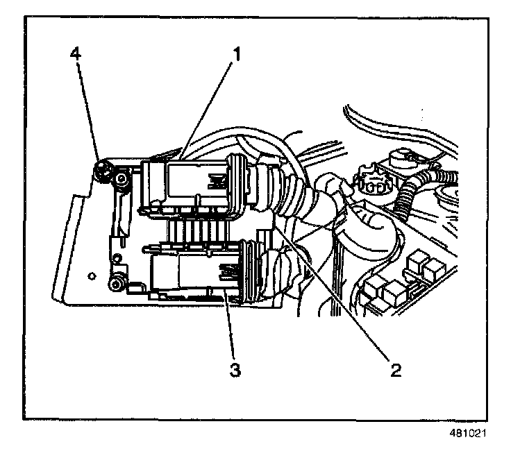 3. Grasp the ECM (2) and slide the unit straight up and out of the underhood relay center