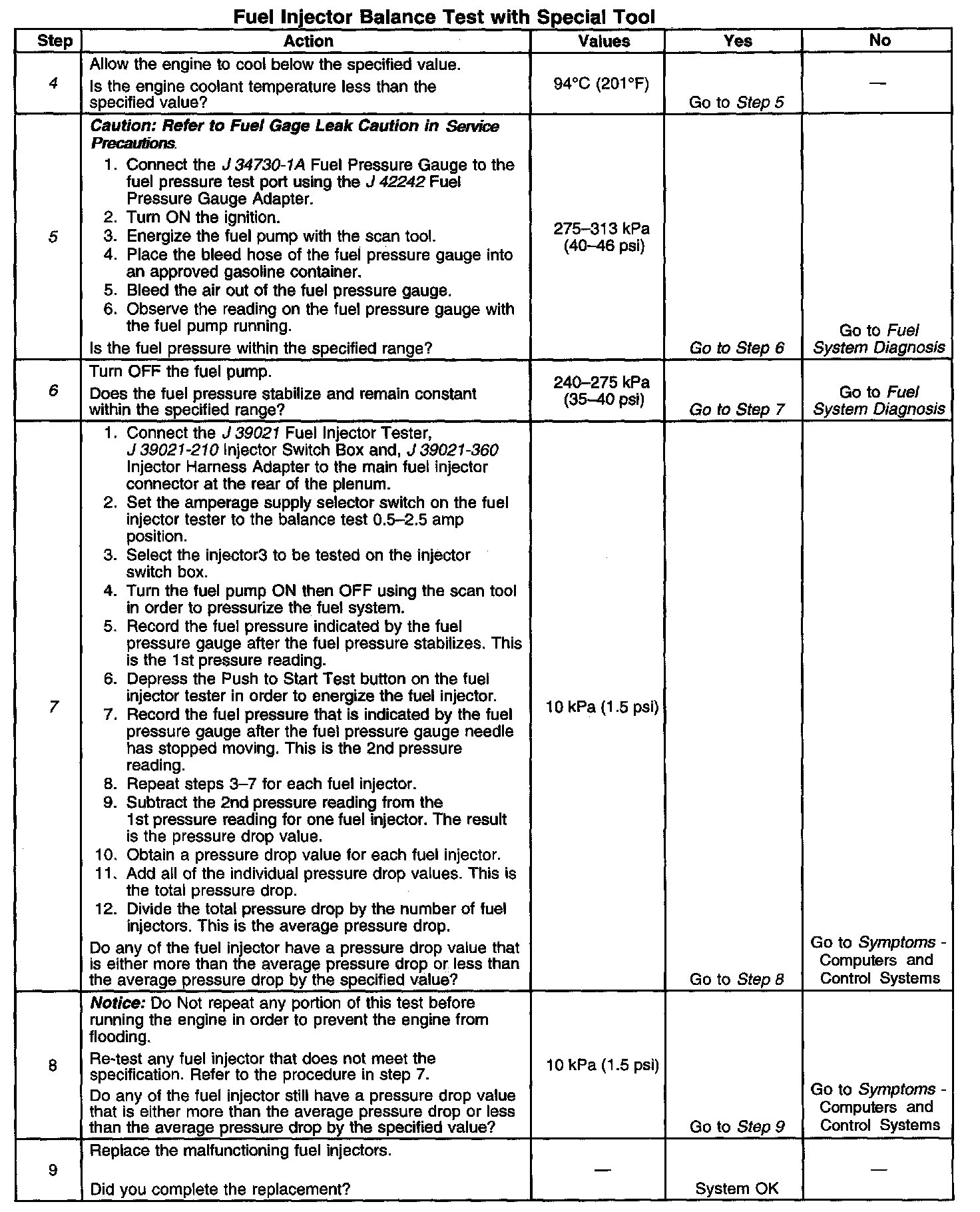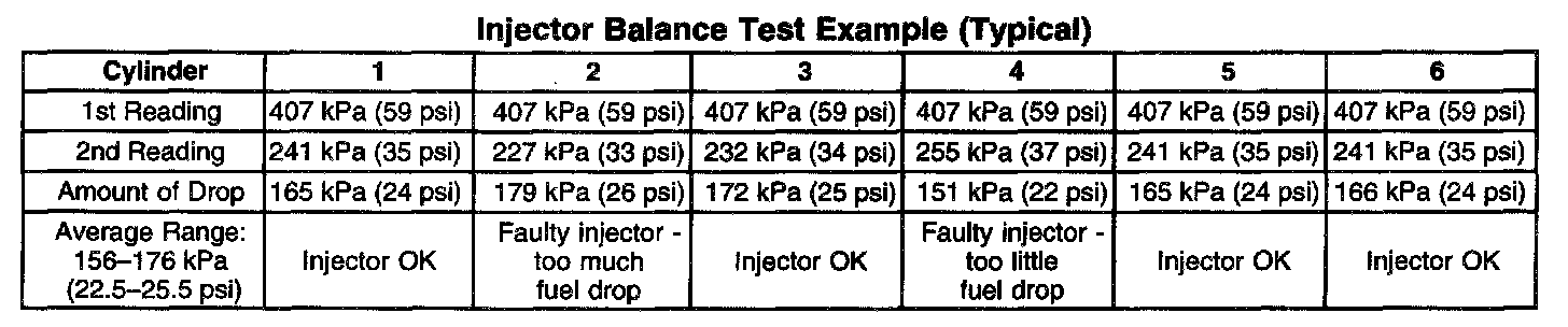 7. If the pressure drop value for each fuel injector is within 10 kPa (1.5 psi) of the average pressure drop value, this indicates that the fuel injectors are flowing properly. Calculate the pressure drop value for each fuel injector by subtracting the second pressure reading from the first pressure reading. Refer to the example above.