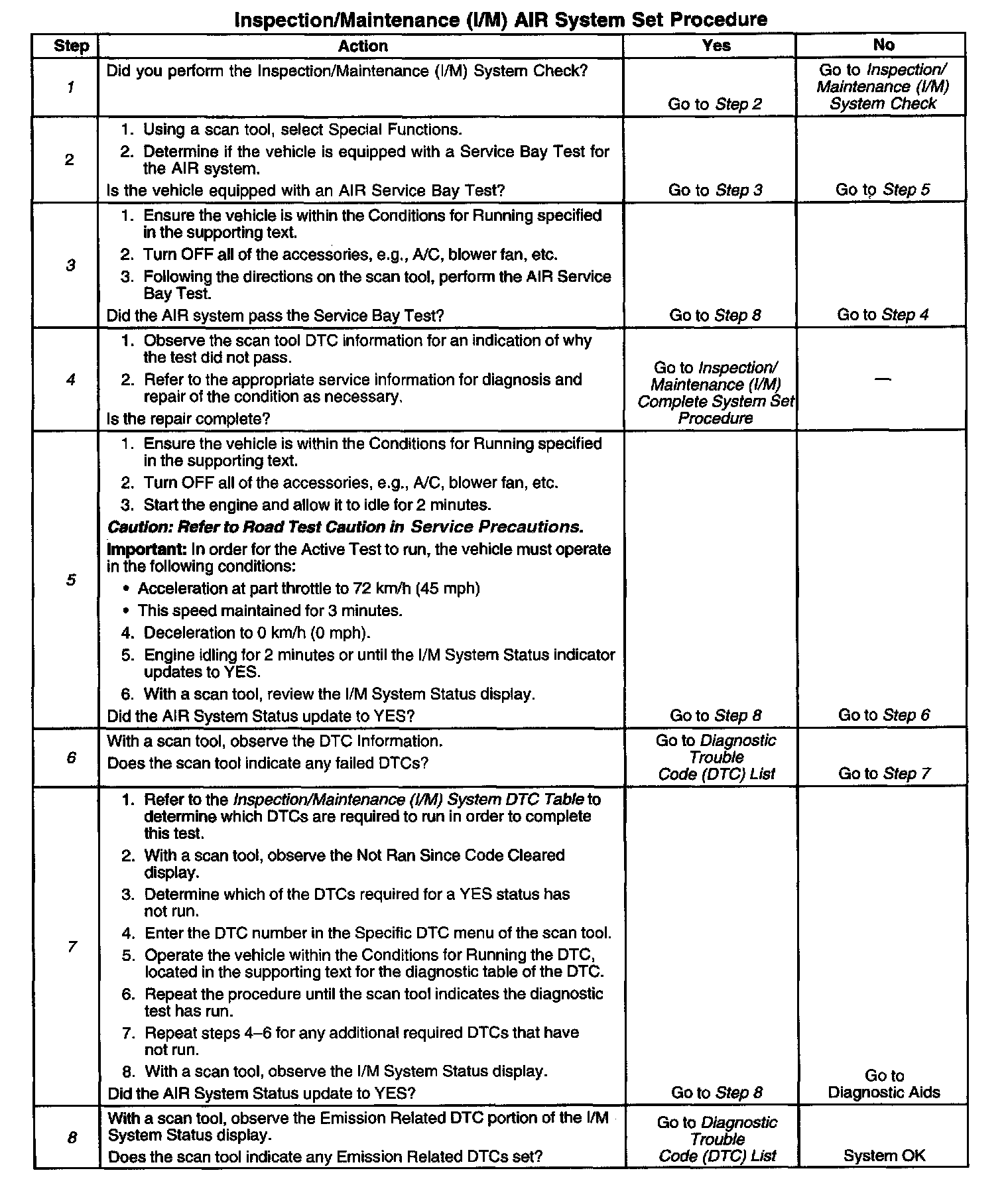 DESCRIPTIONThe purpose of this test is to satisfy the enable criteria necessary to execute I/M readiness diagnostics for the secondary air injection (AIR) system. The test may be used to set the I/M System Status to YES. Ensure the vehicle meets the requirements listed in Conditions for Running before performing this test. Failure to meet the necessary requirements may produce inaccurate test results.