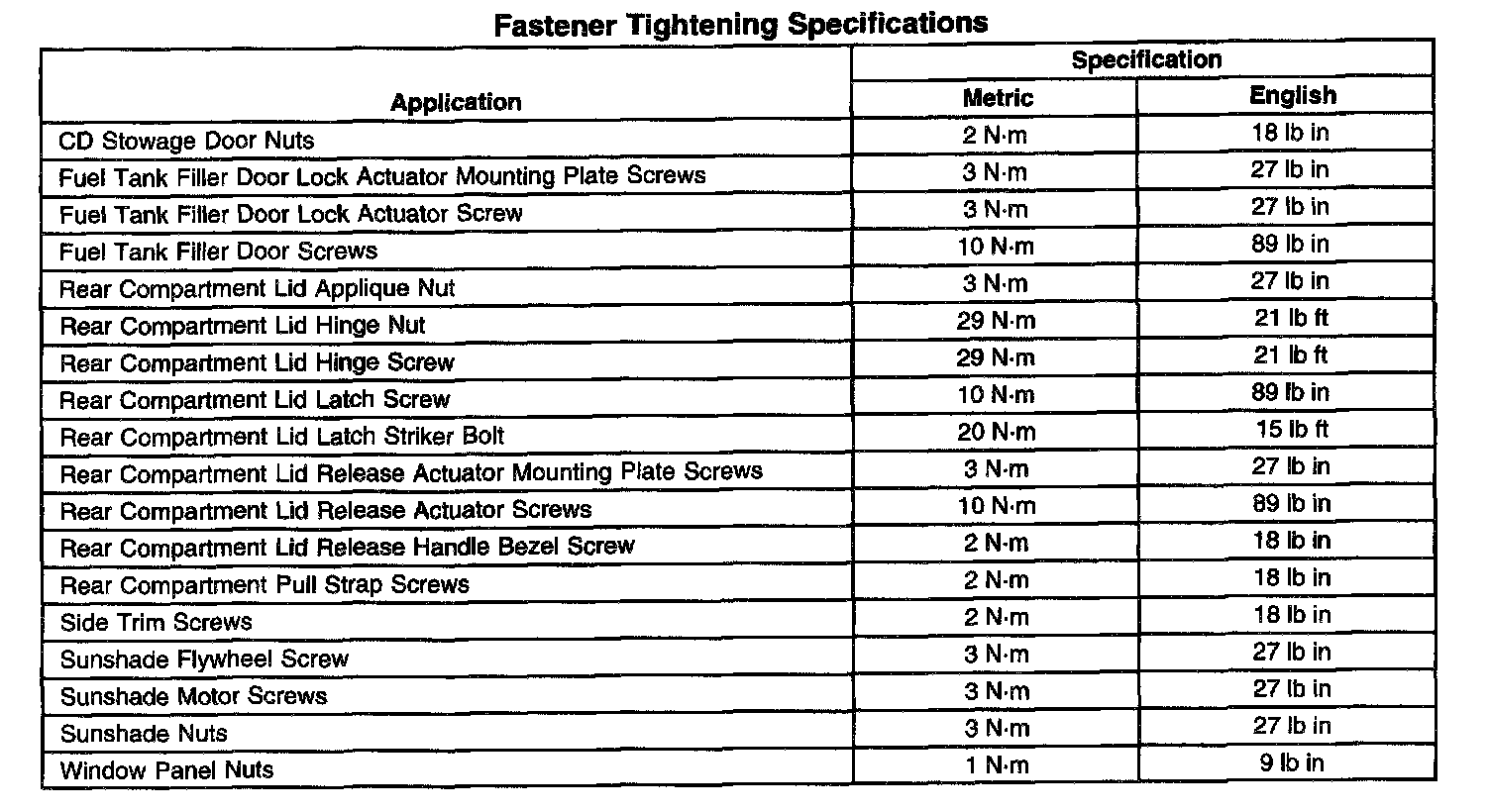 Fastener Tightening Specifications: