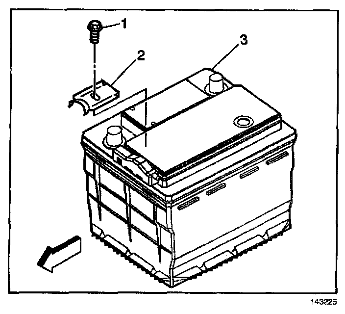 6. Remove the battery hold down retainer bolt (1).