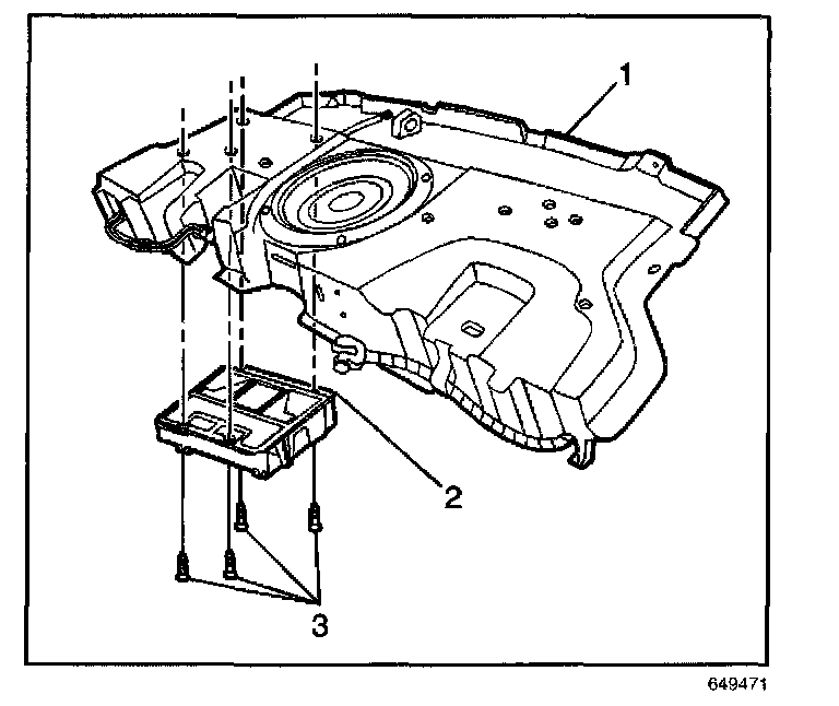 3. Remove the four fasteners (3) retaining the Cellular telephone module and bracket assembly (2) to the rear shelf carrier (1).