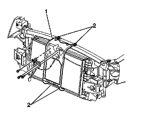 7. Install the fastener (1) in order to secure the upper radiator hose support bracket (2) to the vehicle.