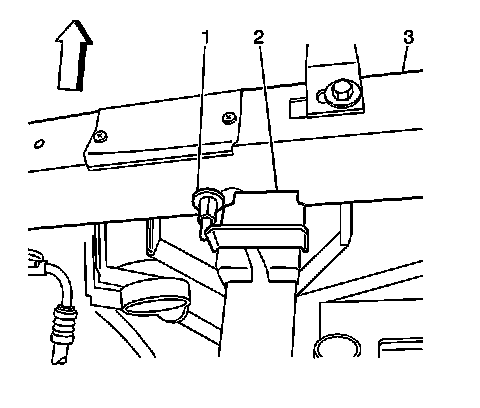 8. Remove the fastener (1) securing the upper radiator hose support (2) to the upper tie bar (3).