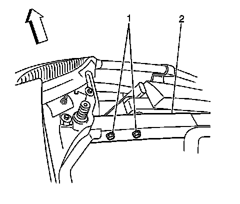 5. Remove the fasteners (2) securing the hood latch support (1) to the vehicle.
