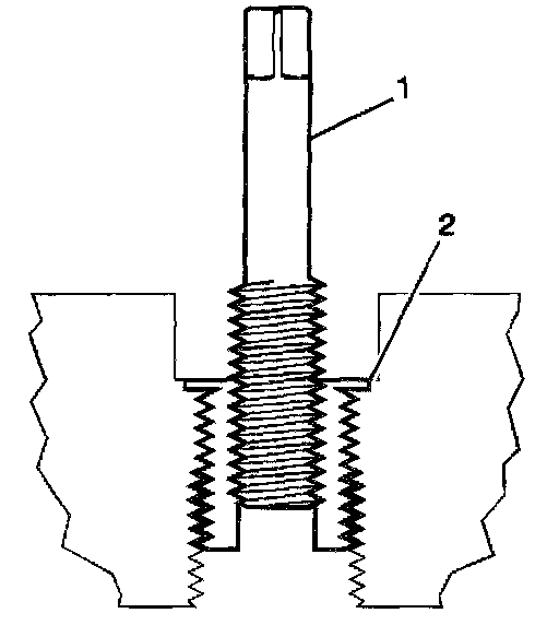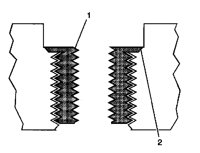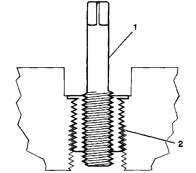 14. Inspect the insert (1) for proper installation (2) into the tapped hole.