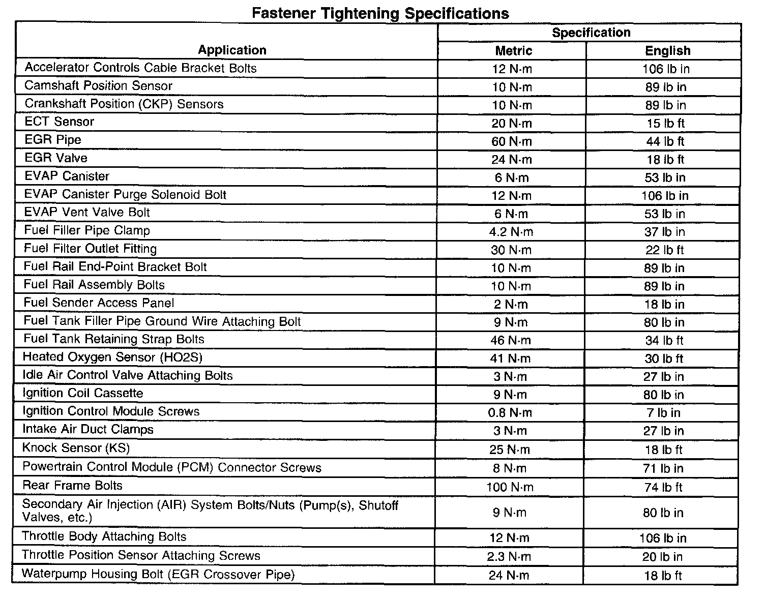 Fastener Tightening Specifications: