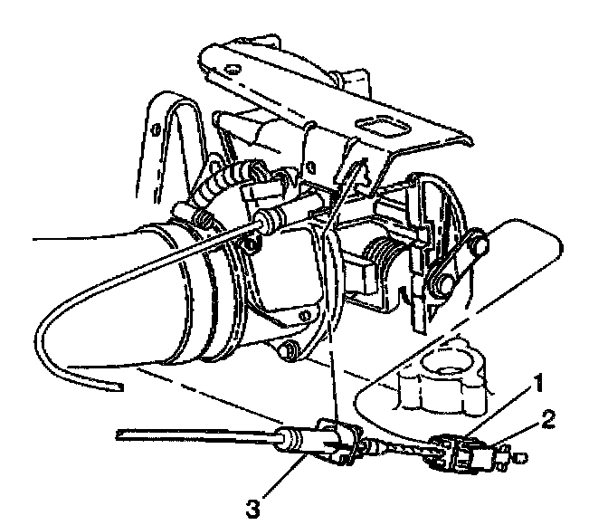 1. Disengage the adjustment lock (2) on the cruise control cable (1) . The adjustment lock (2) is the light-colored button that is located on the throttle body end of the cable. The cable will move freely in and out of the adjuster body when the lock is disengaged.