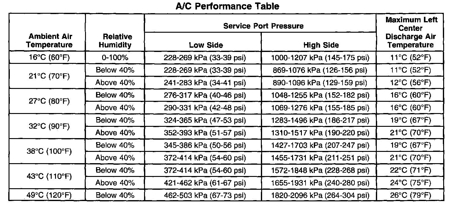A/C Performance Table: