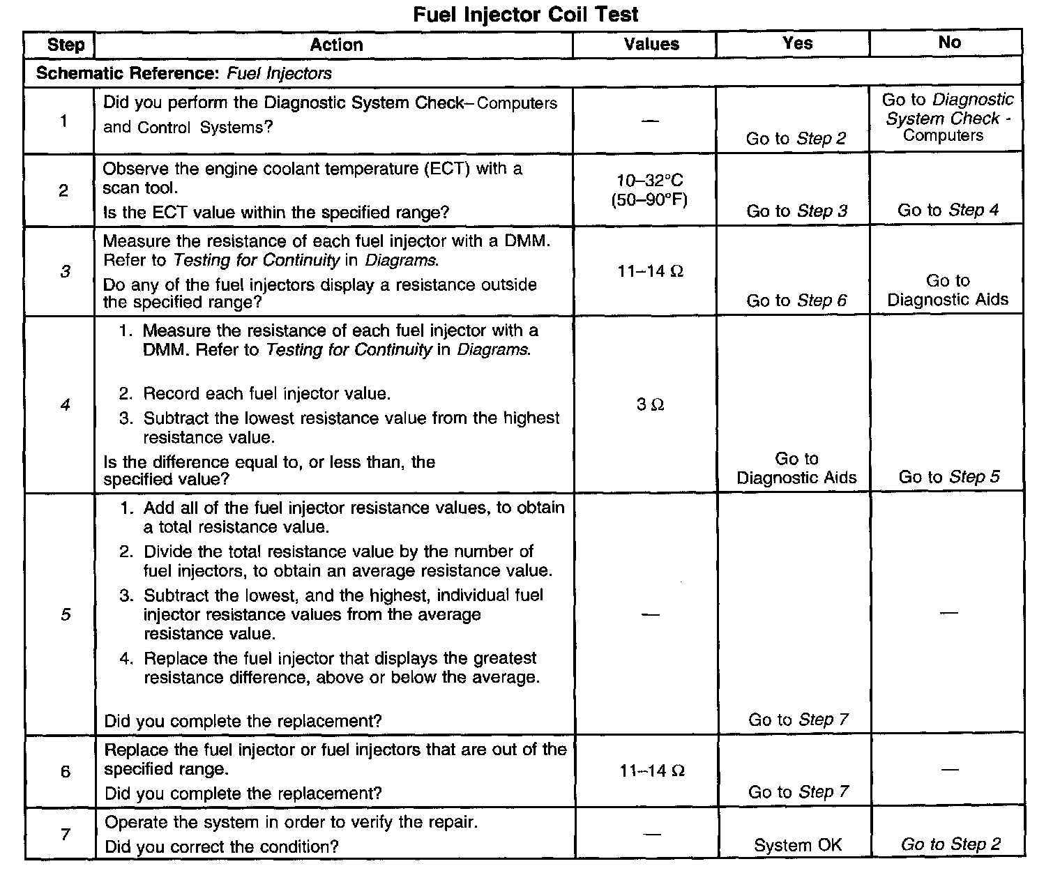 ^ Perform the fuel injector coil test within the conditions of the customers concern. A fuel injector condition may only be apparent at a certain temperature, or under certain conditions.