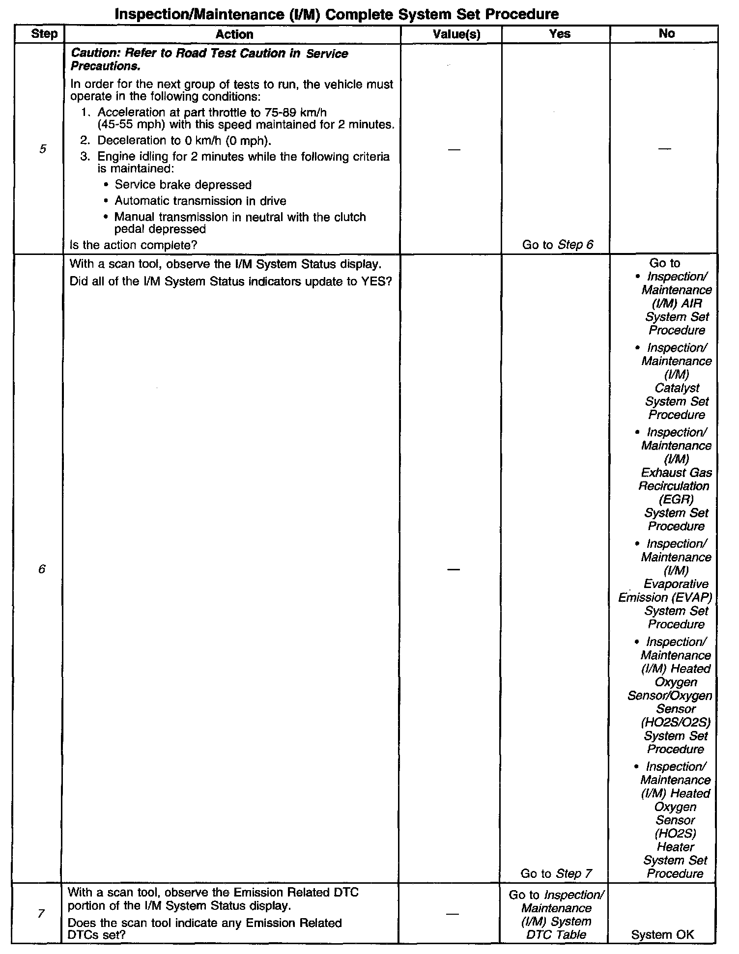 DESCRIPTIONThe purpose of the I/M Complete System Set Procedure is to satisfy the enable criteria necessary to execute all of the I/M readiness diagnostics, and complete the trips for those particular diagnostics. When all diagnostic tests are completed, the I/M System Status indicators are set to YES. Perform this test when more than one or all of the I/M System Status indicators are set to NO.