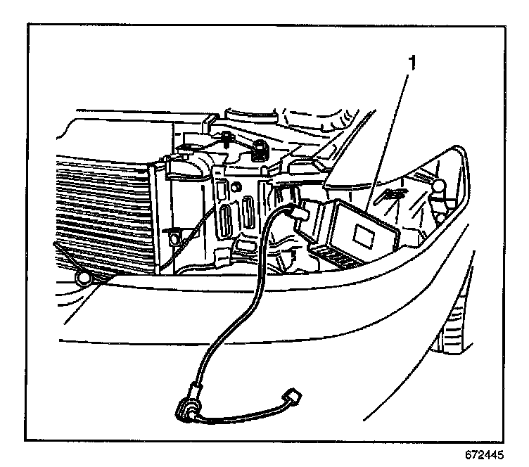 5. Remove the HID ballast (1) from the opening between the headlamp mounting bracket and the front bumper cover.