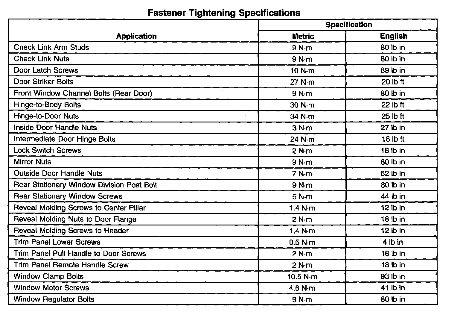 Fastener Tightening Specifications: