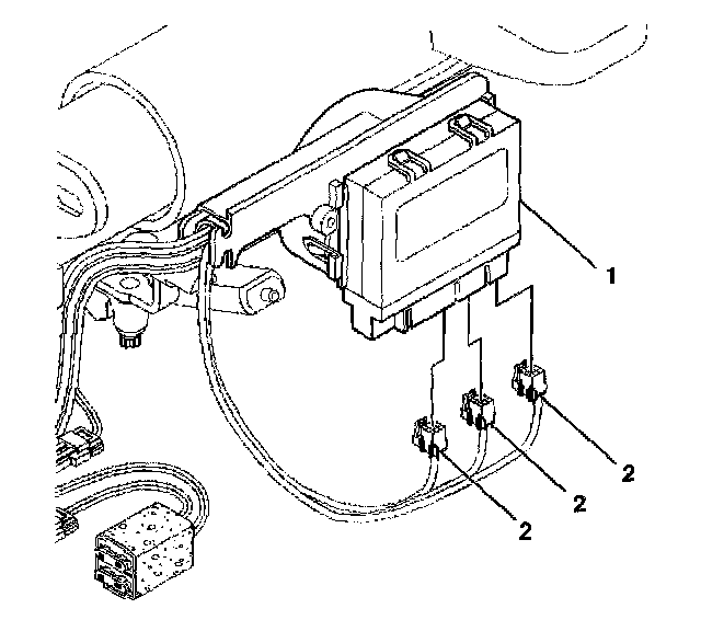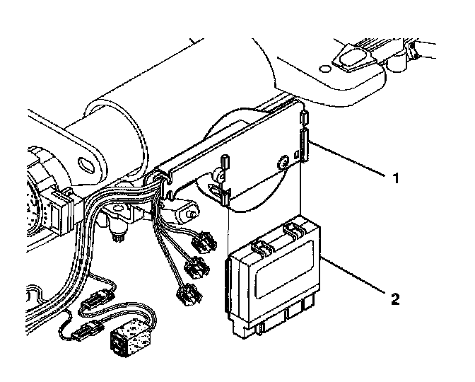 4. Remove the steering column control module (2) from the lower steering column wire harness shield (1) by pulling the module outward (to release retaining clips) and sliding downward.