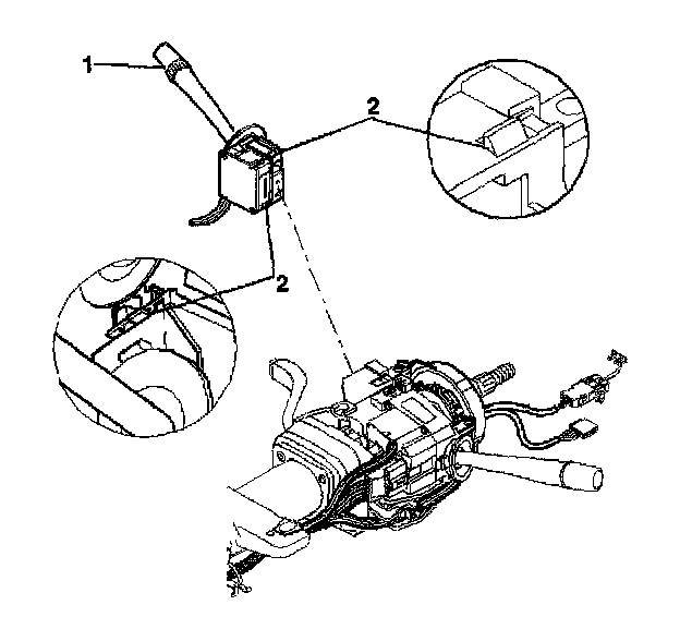 7. Depress the locking tab (1) on the windshield wiper and washer switch (2) and remove the windshield wiper washer switch from the steering column.