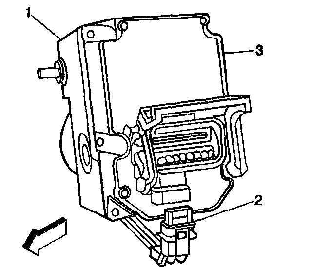 4. Connect the BPMV pump motor harness pigtail electrical connector (2) to the EBCM (3).