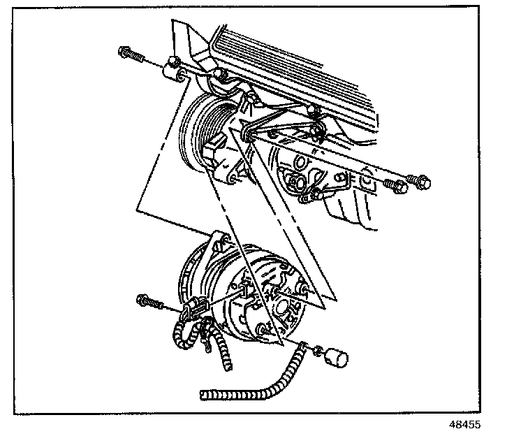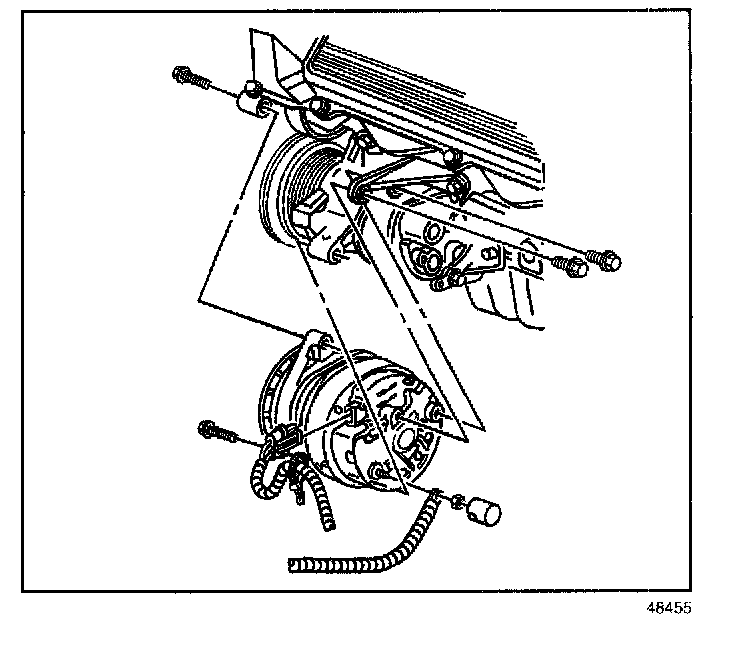 18. Remove the three bolts securing A/C compressor/generator front bracket to the engine and A/C compressor.