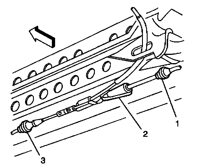 5. Remove the intermediate parking brake cable from the equalizer (2) and move the intermediate cable clear of the suspension support.