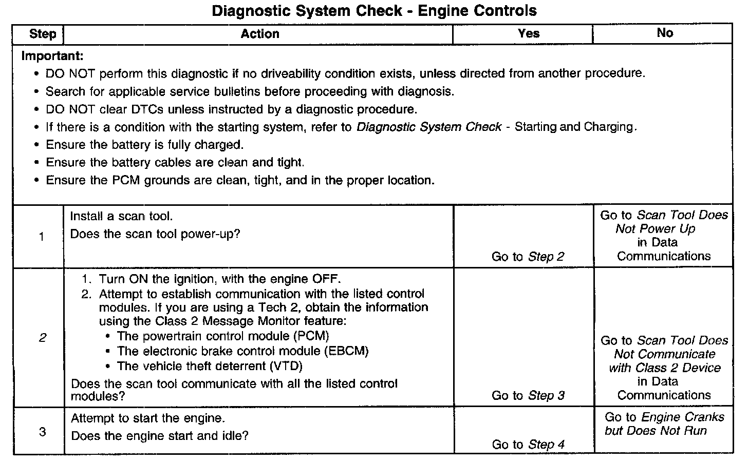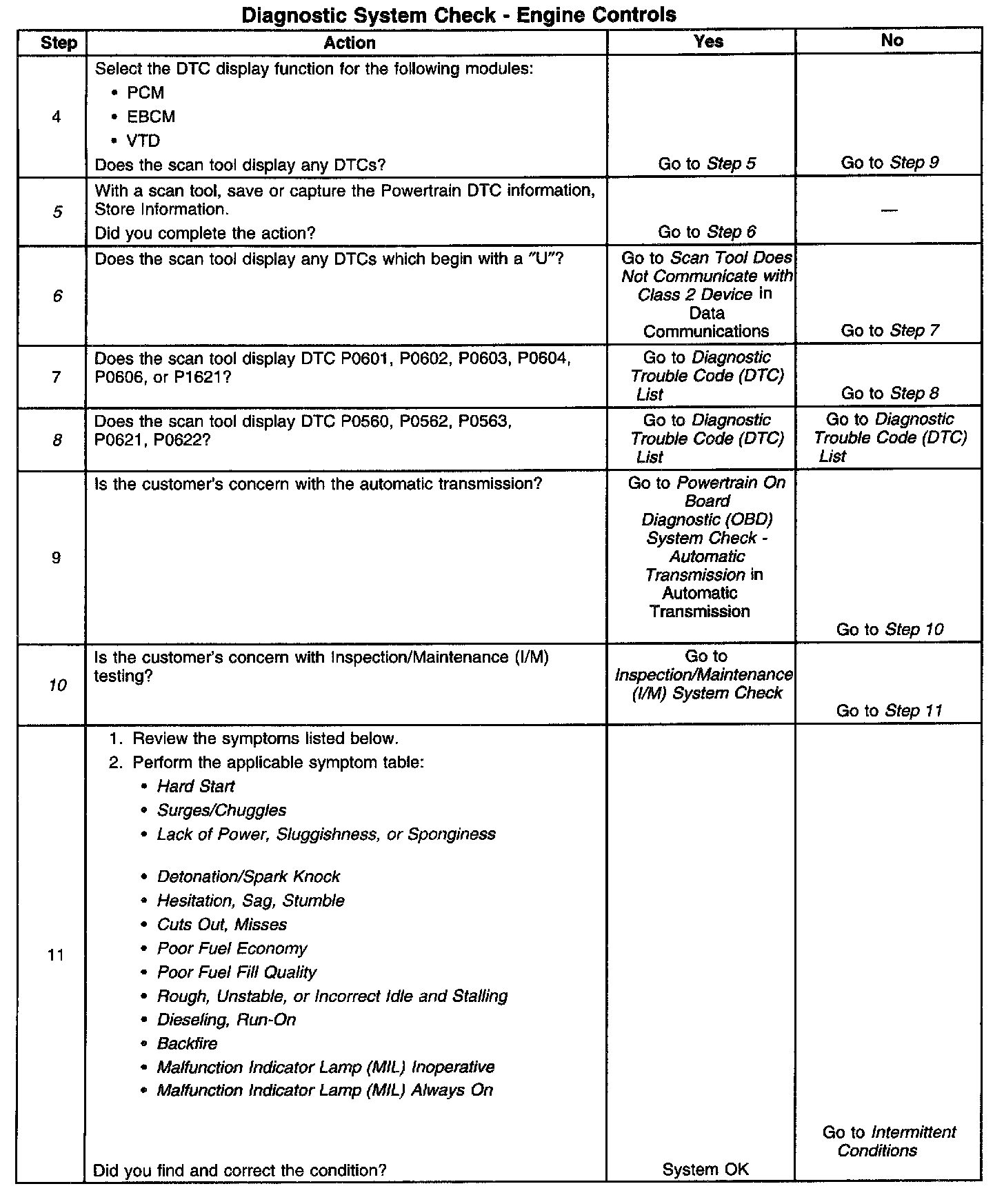 The Diagnostic System Check - Computers and Controls Systems is an organized approach to identifying a condition that is created by a malfunction in the powertrain control system. The Diagnostic System Check must be the starting point for any driveability concern. The Diagnostic System Check directs the service technician to the next logical step in order to diagnose the concern. Understanding and correctly using the diagnostic table reduces diagnostic time, and prevents the replacement of good parts.