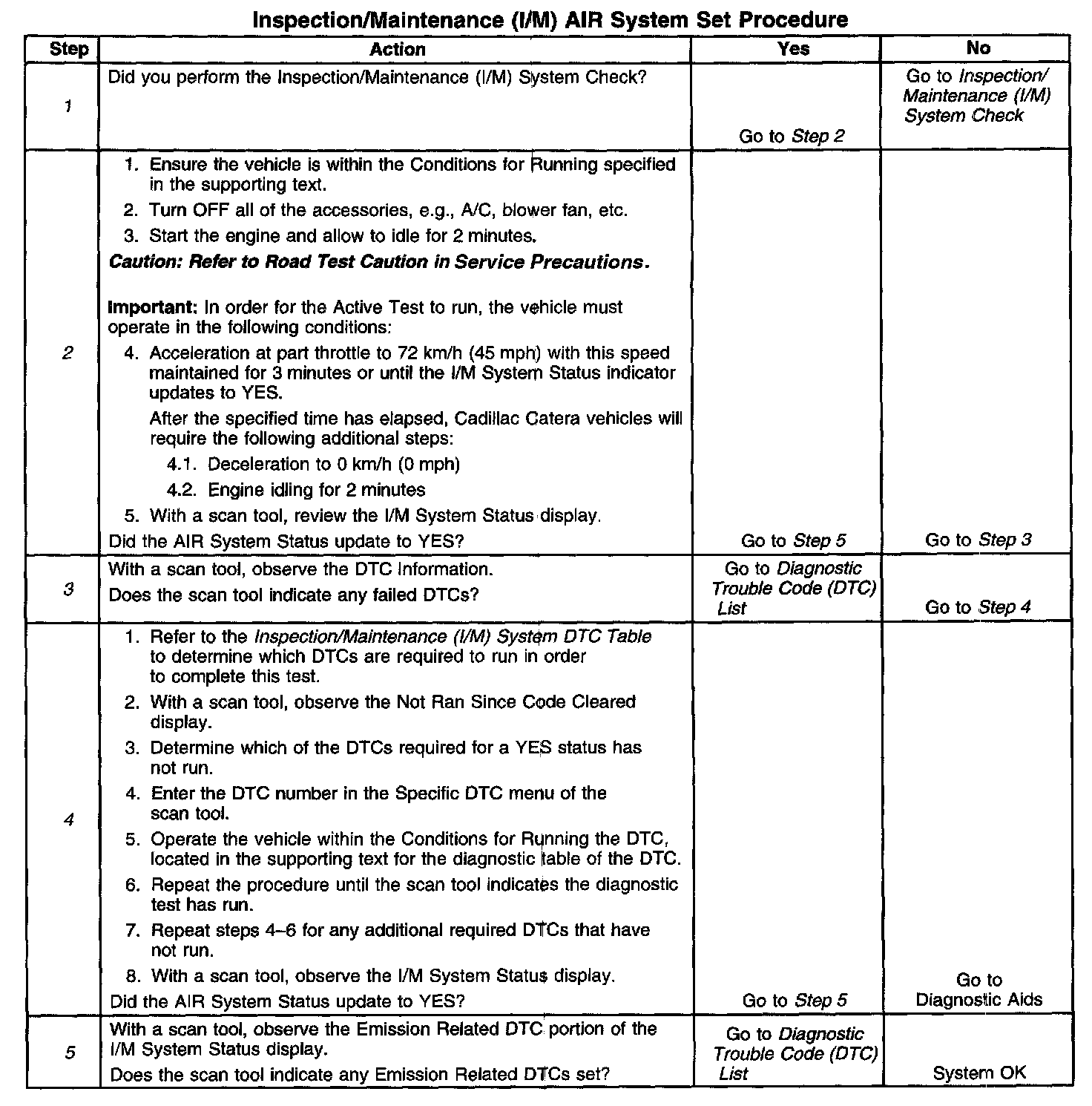 1. Make sure you perform the I/M System Check before performing this test. Failure to do so may result in difficulty updating the status to YES. Inspection/Maitenance (I/M) System (DTC) Table