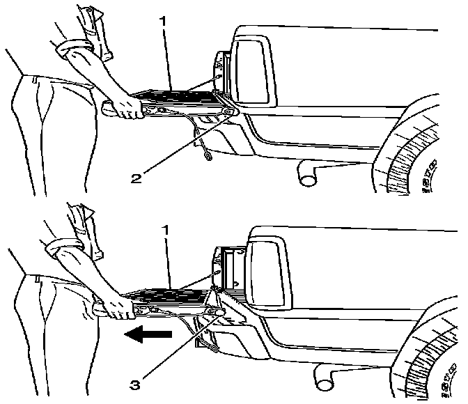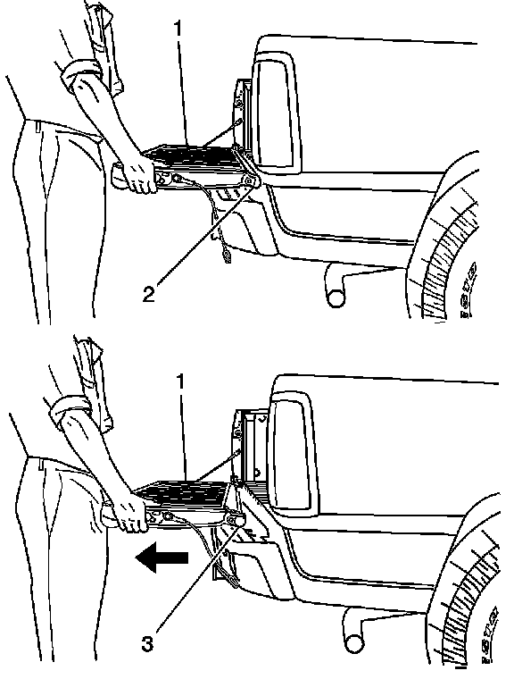 2. With the tailgate (1) completely open as shown in the upper part of the illustration, pull the RIGHT SIDE of the tailgate rearward as shown in the lower illustration. Do not pull on the left side of the tailgate.