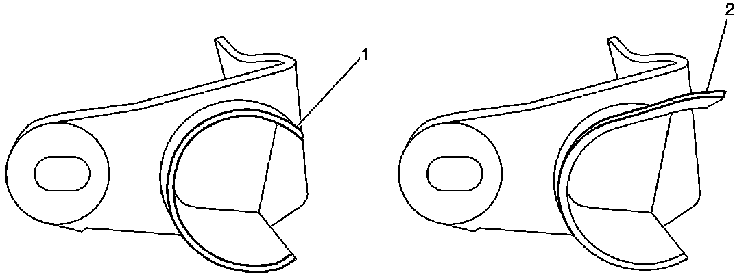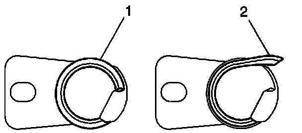 3. With the right side of the tailgate disengaged from the pickup box, inspect the hinge on the right side of the tailgate for damage. The illustration above shows an undamaged hinge (1) and a damaged or bent hinge (2).