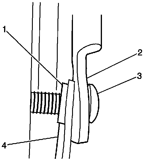 7. Place an interior trim removal type tool (2) between the support cable end (3) and the latch (1), and pry the two apart. As the two spread apart, the toothed or plastic nut on the other side of the latch will begin to move towards the end of the bolt.