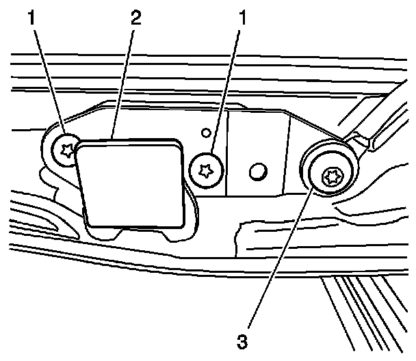 5. If the toothed or plastic nut is present, loosen the other two bolts (1) attaching the latch (2) to the tailgate. DO NOT remove these bolts.
