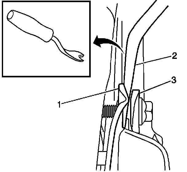 6. Place an interior trim removal type tool (2), or equivalent, between the support cable end (3) and the latch (1), and pry the two apart. As the two spread apart, the toothed nut on the other side of the latch will begin to move towards the end of the bolt.