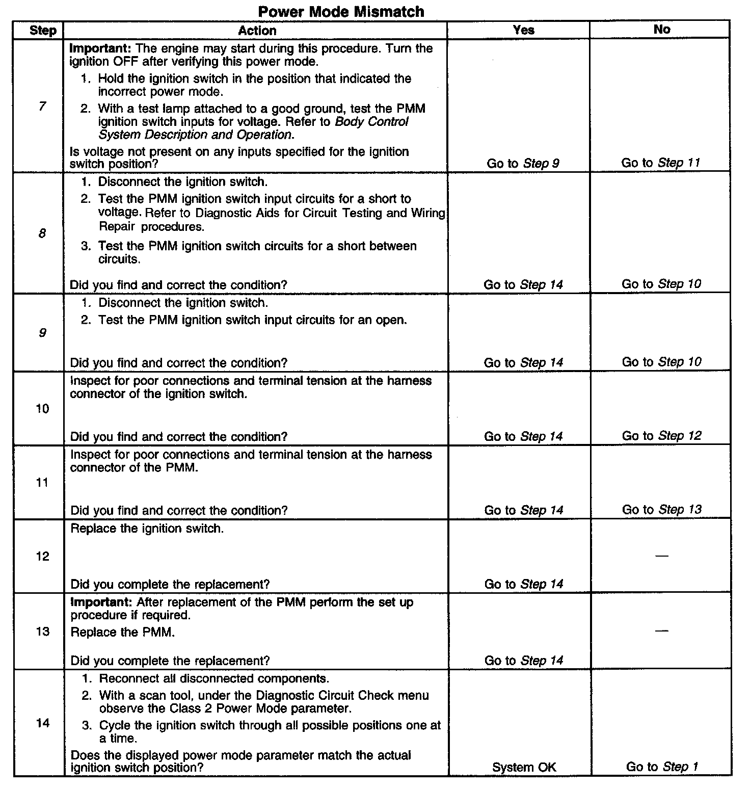 CIRCUIT DESCRIPTIONNormal vehicle class 2 communications and module operations will not begin until the system power mode has been identified. Discrete wires from the ignition switch contacts are monitored by the power mode master (PMM) module in order to determine the correct power mode. The PMM communicates the system power mode to all class 2 modules on the class 2 serial data line. Refer to Body Control System Description and Operation to identify which module is the PMM and the applicable power mode look up table.
