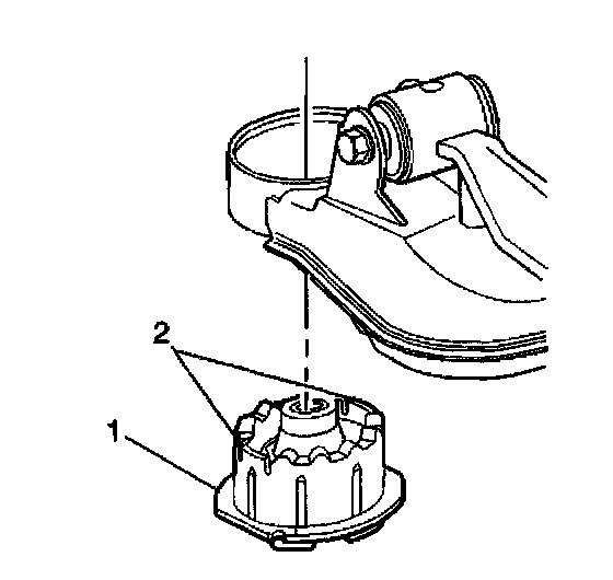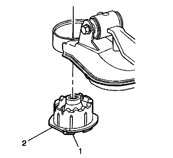 1. Tap the mount into the support assembly ensuring the flat is outboard (2) and the notch (1) is rearward upon the installation.