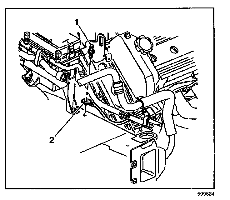 2. Remove the bolt (1) securing the engine ground cable (2) to the right side body frame rail.