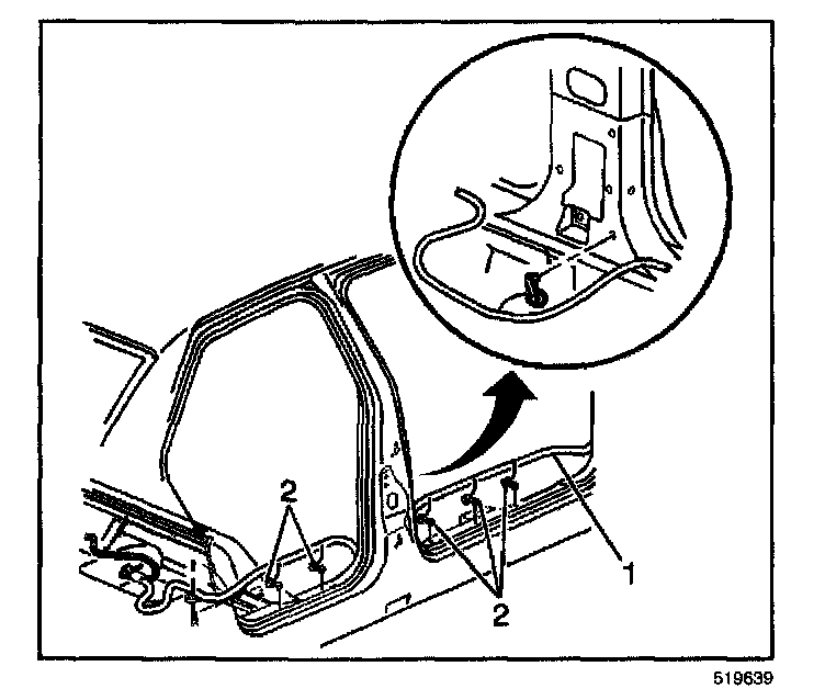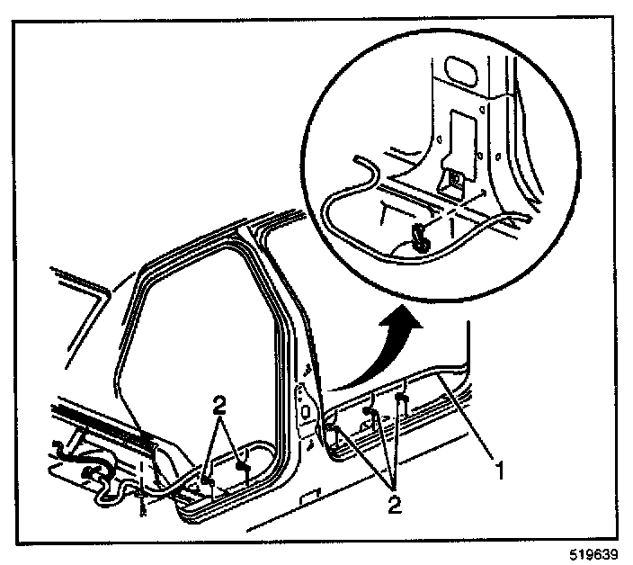 4. Route the battery cable (1) along the rocker panel and install the cable retainers (2).